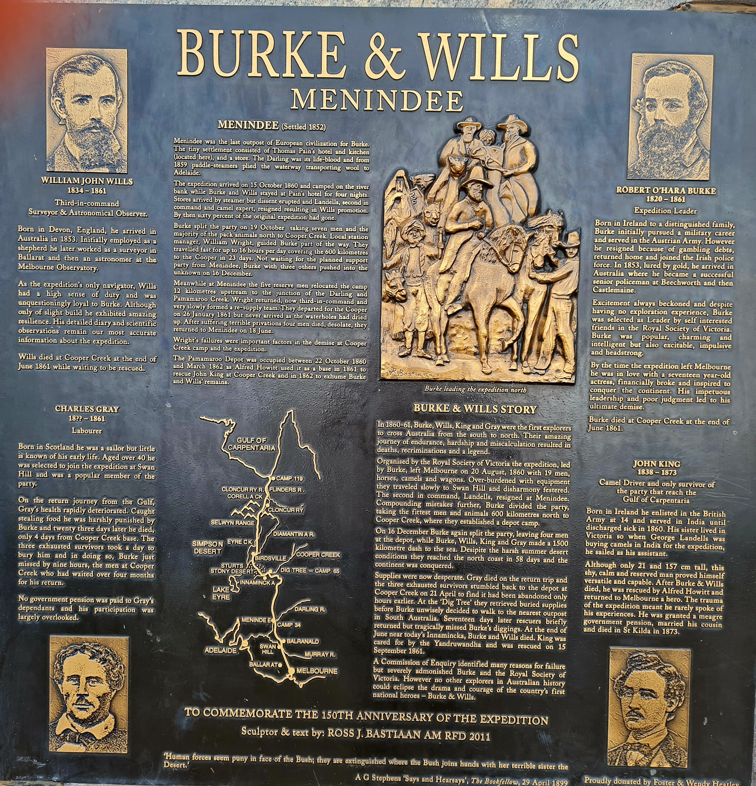 In the small town of Menindee, outside the hotel is this plaque which tells the story of intrepid explorers Burke and Wills who were searching for the inland sea.