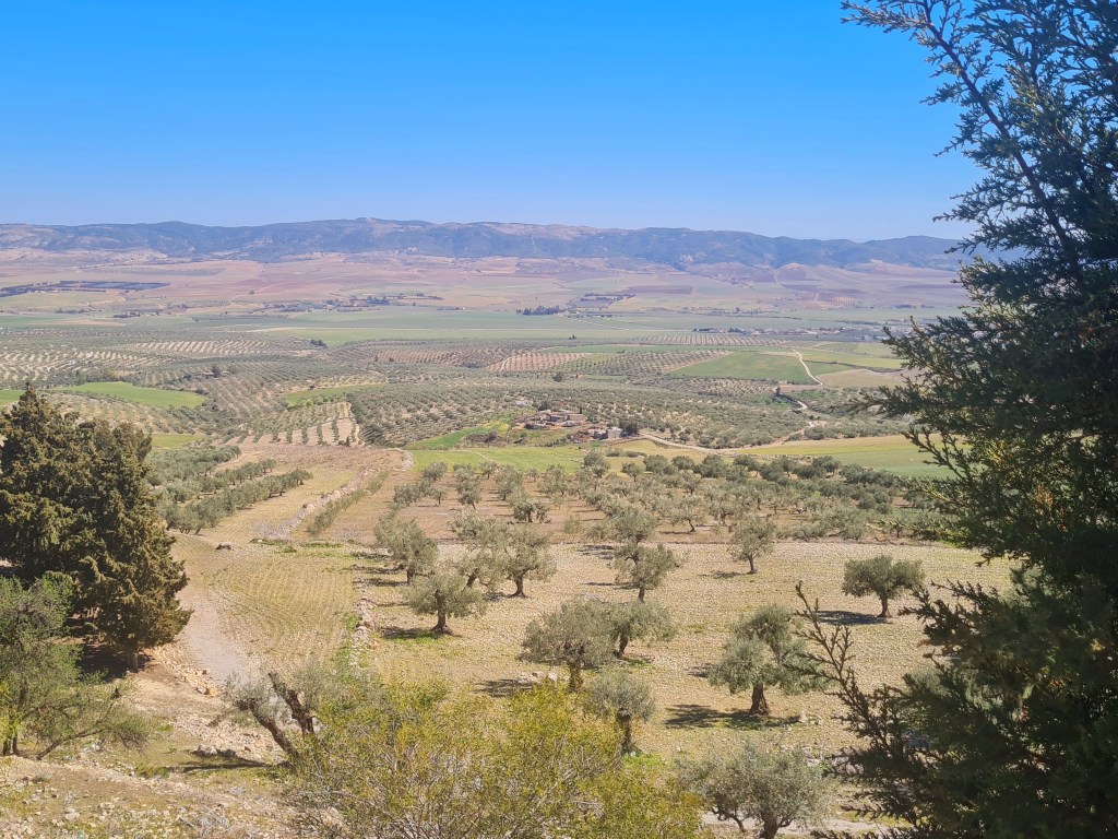 Beautiful views from Dougga over a fertile, olive tree landscape.