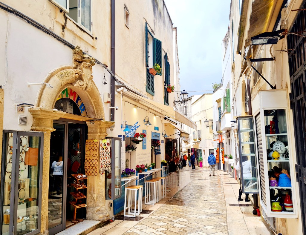 Time to stroll the narrow cobbled streets admiring the cream sandstone churches and palazzos, time to look inside shops selling gorgeous clothes, leather goods, art works and brightly coloured ceramics and time to pull up a chair at an outdoor cafe and savour a strong latte macchiato or an Apulia wine (or both) and watch the passing parade.